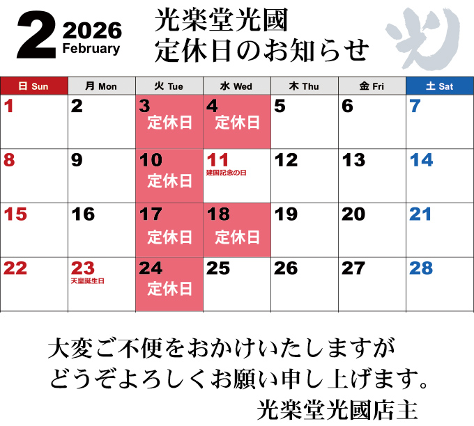 2026年2月1日 / 最終更新日時 : 2026年2月1日 KishidaAyako 営業日お知らせ 2026年2月本店定休日のお知らせ いつも光楽堂光國をご愛顧いただきましてありがとうございます。2月の本店定休日は3日(火)4日(水)10日(火)17日(火)18日(水)24日(火)になります。どうぞよろしくお願い申し上げます光楽堂光國店主